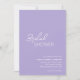 Moderner Lavendel / lila Brautdusche Einladung mit einem einfachen und minimalen Design mit dem Veranstaltungstitel in einem eleganten Drehbuch und einem zeitgenössischen serifenlosen Schriftart. Unten unten rechts finden Sie Ihre Veranstaltungsdetails in minimalistischem Layout.