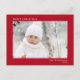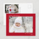 Elegante rote Urlaubspostkarte mit minimalem modernem Design mit Ihrem Foto und "Frohe Weihnachten", Ihrem Namen und dem Jahr in schlichter weißer Typografie. Auf der Rückseite fügen Sie ein zusätzliches Foto und Ihre personalisierte Begrüßung zu Familie und Freunden.