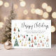 Die minimale moderne Weihnachtskarte mit abstrakten Retro-Illustrationen von Grün-, Terrakotta- und Goldbäumen und Sternen, "Happy Holidays" in einem stilvollen Drehbuch und Ihrem Gruß und Namen in einfacher Typografie. Fügen Sie auf der Rückseite zwei Fotos und eine personalisierte Nachricht hinzu.