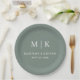 Diese eleganten, modernen Hochzeitszeitszettel oder Brautparty Paper Teller zeichnen sich durch ein schlichtes, grün-weißes Textdesign aus, das minimalistisch wirkt. Fügen Sie Ihre Initialen oder Monogramme hinzu, um sie komplett zu Ihrem eigenen zu machen.