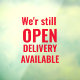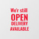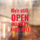 Lass deinen Kunden, dass du mit diesem fett roten "We're Still OPEN - Delivery Available" Fensterheber für sie noch immer da bist. Ideal für Restaurants, Warenzähler, Lebensmittelgeschäfte und andere kleine Unternehmen, die Zustelldienste anbieten. Dieses große Klebeschild ist für eine klare Sichtbarkeit, auch aus der Entfernung, konzipiert. Einfach auf Fenster oder Glastüren anwendbar und vollständig für Ihre Bedürfnisse anpassbar.