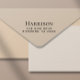 Rücksendeadresse Briefmarke mit Ihrem Familiennamen in klassischer Serifentypografie und Ihre Adresse in minimaler moderner Schrift.