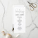 Einfaches, minimalistisches, schwarz-weißes, modernes Skript-Hochzeitsprogramm, mit Foto des Ehepaares hinten.