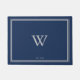 Eine Türmatte mit einem minimalen Monogramm, das in der Mitte gerahmt ist. Darunter unten ist das etablierte Datum Ihrer Familie. Der Hintergrund enthält eine tiefe Marine. Der Außenrahmen ist silber, um den Hintergrund mit dem silbernen Monogramm zu ergänzen.