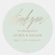 Liebe dieses eleganten und modernen Aufklebers mit Gastgeschenk Hochzeit und schimmerndem Imitat aus metallischem Gold "Danke" auf einem hellgrünen Hintergrund, der Ihren Gastgeschenke Hochzeiten eine elegante und persönliche Touch verleiht. Passen Sie Ihre Namen und Ihr Hochzeitsdatum an, um einen einzigartigen Sake für Ihre Gäste zu schaffen. Das schlichte und dennoch raffinierte Design ergänzt jedes Hochzeitsthema perfekt und macht es zu einer wunderschönen Touch für Ihren besonderen Tag.