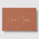 Dieses kleine und elegante Gästebuch aus Terracotta bietet Ihnen die Wahl zwischen echter Goldfolie, Silber oder Rose, Ihren Namen in einem schicken, modernen Drehbuch und Ihren Hochzeitstermin und Ihre Lage in klassischer Serifentypografie.