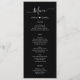 Minimalistische Elegant Simple Typografy Heart Black Wedding Menu Card ist ideal für eine moderne minimale Hochzeit. Design mit schwarz handgeschriebener Typografie/Kalligrafie, kleines Herzmotiv der Liebe zwischen dem Pärchennamen in Weiß auf schwarzem Hintergrund, mit einem schlichten, sauberen Look. Diese Speisekarte kann für Hochzeitsfeiern, Proben oder jede Veranstaltung verwendet werden. Große Hochzeitskarte für moderne Hochzeit, minimalistische Hochzeit und klassische Hochzeit. Einfach zu anpassen.