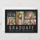 Minimal moderne Schwarz-Abschluss-Ankündigung für ihn oder sie mit einer 5-Bild-Foto-Collage und "Graduate" auf dem Boden in großen weißen Hauptstädte Buchstaben geschrieben. Fügen Sie das Unterrichtsjahr, den Namen und die Schule oder die Universität in der einfachen weißen Typografie hinzu.