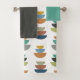 Ce kit de serviettes est doté d'un linge turquoise, d'une serviette à main noire au charbon de bois et d'une serviette de bain au design moderne du milieu du siècle de demi-cercles empilés en trois couleurs rétro sur un champ de blanc. Voulez-vous le même design avec des couleurs différentes? Message-moi.