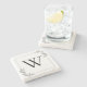 This coaster features a clean, minimalist design with a soft, neutral aesthetic. At the center is a large, elegant serif letter initial creating a refined monogram look. A thin, delicate border frames the design, adding structure without overpowering the simplicity. In two opposite corners, small botanical line illustrations—featuring simple leaves and tiny blossoms—add a gentle, organic touch. These understated floral accents soften the overall look and bring a hint of nature-inspired charm. Overall, the coaster blends modern minimalism with rustic elegance, making it perfect for a sophisticated, neutral home décor style.