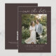 This save the date card features an engagement photo framed by elegant handwritten script on a rich mocha brown background. The clean, modern layout highlights your photo while keeping the announcement timeless and romantic. The back includes a QR code so guests can easily visit your wedding website for details and celebration information. Personalize the names, date, and location to share your wedding plans with friends and family.