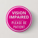 This vibrant button features the slogan 'Vision Impaired, please be patient' in a bold white font. You can edit the text as needed. The background is hot pink to grab people's attention. 💖 For more girly blindness pins, visit my store: Zazzle.com/Elder_Vitality 💖 For custom orders, message me on Zazzle