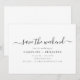This save the weekend card features elegant script lettering and a clean minimalist layout for announcing a wedding weekend celebration. Perfect for destination weddings or multi-day events where guests should reserve the full weekend. The modern typography keeps the focus on the couple’s names, date, and location. A simple and stylish way to share wedding plans and direct guests to the website for details.