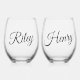 Minimalistic Custom Couple Names Script Stemless Wine Glass. Personalize with you and your significant other's names in elegant script lettering. Perfect as a wedding gift, a keepsake for newlyweds, or as an engagement gift.