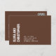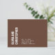 Die Save the Date flache Karte zeichnet sich durch ein elegantes und minimalistisches Design mit dunkelbraunem Hintergrund aus, das ein Gefühl von Eleganz und Wärme hervorruft. Weiße, fette Buchstaben werden strategisch auf der Vorderseite platziert und zeigen die wesentlichen Details wie die Namen des Paares und das Datum der Veranstaltung. Die Typografie ist sauber und modern und trägt zur kühlen Ästhetik bei. Das Design vermeidet absichtlich zusätzliche Dekorationen, sodass der Kontrast zwischen weißem und dunkelbraunem Hintergrund ein Brennpunkt ist. Auf der Rückseite der Karte bleibt der minimalistische Ansatz erhalten, wobei der dunkelbraune Hintergrund beibehalten wird. Ein QR-Code wird hervorgehoben angezeigt, der es den Empfängern ermöglicht, einfach auf weitere Informationen über die Hochzeit oder den Link zu einer Hochzeitswebsite zuzugreifen. Der QR-Code fügt dem Design eine moderne und technisch versierte Touch hinzu. Die Save the Date flache Karte ist sowohl in gedruckter als auch in digitaler Form erhältlich und bietet somit Flexibilität für Empfänger, die eine physische Karte bevorzugen, sowie für diejenigen, die eine digitale Version bevorzugen. Die digitale Version ermöglicht eine einfache gemeinsame Nutzung über verschiedene Online-Plattformen und macht es den Empfängern bequem, zusätzliche Informationen Save the Date zu erhalten und darauf zuzugreifen. Dieses minimalistische und fett Save the Date gestaltete Kartendesign schafft ein Gleichgewicht zwischen Einfachheit und Modernität und bietet den Paaren eine stilvolle und anpassbare Möglichkeit, ihre Hochzeit anzukündigen.