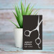 Elegante, vollständig anpassbare Visitenkartenvorlage mit IMITATEN silberner Schere und dunkelgrauem Hintergrund. Perfekt für Haarstylisten, Friseursalons.