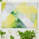 Das Bild zeigt eine lebendige, abstrakte Anordnung aus überlappenden Formen und Farben. Gelb, Grün, Orange und Grau verschmelzen in einer dynamischen, aber harmonischen Weise, unterbrochen von texturierten Mustern und geometrischen Linien. Es vermittelt ein Gefühl von Energie und Kreativität, während die Minimalität eine beruhigende Klarheit ausstrahlt.