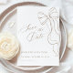 Verkünden Sie Ihren besonderen Tag mit zeitloser Schlichtheit. Diese minimalistische Save the Date Karte enthält eine zarte Beige-Schleifen-Illustration und elegante Skript-Typografie. Ihre neutralen Töne und das saubere Design machen sie perfekt für moderne, kultivierte Paare, die dezente Eleganz lieben.