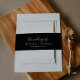 Diese minimalistische schwarze Hochzeit Einladung Bauchband ist perfekt für eine boho Hochzeit. Das moderne romantische Design besticht durch klassische weiße Typografie auf dunkelschwarzem Hintergrund. Personalisieren Sie diese Papierbauch Bänder mit den Namen der Braut und Bräutigam, und das Hochzeitstag.