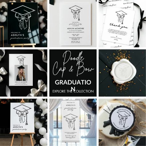 Feiern Sie den großen Tag Ihres Absolventen mit dieser stilvollen minimalistischen Abschlussfeier! Dieses moderne Schwarz-Weiß-Design mit einem handgezeichnet Doodle aus einer Graduierenkappe, die mit einem süßen Bogen geschmückt ist, ist elegant und zeitlos zugleich. Diese Einladung eignet sich perfekt für High School- oder Uni-Grads und ist leicht zu personalisieren mit Ihren Veranstaltungsdetails. Eine elegante Designerwahl für Ihre Abschluss-Feier!
