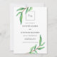 Diese modernen, minimalistischen Einladungen Save the Date mit einem klaren, weißen Hintergrund mit grünen Aquarellfarben-Blätter und schwarzem Text. Auf der Rückseite der Karte befindet sich Ihr eigenes Foto zum Bluten.