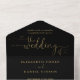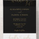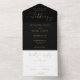 Alles in einer Einladung zur Hochzeit mit eleganten goldenen Herzen Schrift Typografie und Monogramm Initialen auf schwarzem Hintergrund. Die Einladung enthält eine perforierte RSVP-Karte, die für Sie individuell adressiert oder links als leere Karte für die Handschrift der Adressdaten Ihres Gastes verwendet werden kann. Entwickelt von Thisisnotme©