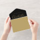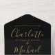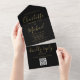 Alle in einer Hochzeitseinladung mit elegantem goldenen Signatur-Script-Namen und Monogramm-Initialen auf schwarzem Hintergrund. Die Einladung enthält eine perforierte RSVP-Karte mit Ihrem Hochzeitswebsite QR Code. Entwickelt von Thisisnotme©