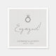 Die Servietten der Anhängergruppe sind in einem minimalistisch-grauen Typografie-Design gehalten. Funkelnde Verlobung Ring und das Wort "verlobt!" über die Serviette in einem Skript-Schriftart und die Nachricht "Glückwunsch" darunter. Passen Sie die Namen des Paares an.