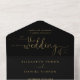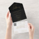 Alles in einer Schwarz-Gold-Hochzeitseinladung mit eleganten Herz-Schrift-Typografie und Monogramm-Initialen. Die Einladung enthält eine perforierte RSVP-Karte mit Ihrem Hochzeitswebseiten QR Code und Details. Entwickelt von Thisisnotme©