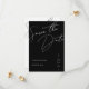 Minimalistische schwarze Script Typografie Hochzeit speichern Sie die Date Card. Erhöhen Sie Ihre Hochzeit mit unserer modernen schwarzen Drehbuch Typografie Hochzeit speichern Sie das Datum, eine zeitlose Wahl für Ihren besonderen Tag. Diese wunderschöne Hochzeitskarte verbindet klassische und elegante Designelemente nahtlos mit einer vereinfachenden, weißen Ästhetik und schafft einen auffallenden Kontrast, der einen formalen und raffinierten Set verleiht. Die Einfachheit des schwarzen Farbschemas und die Eleganz der weißen Typografie machen dieses rett-the-date zu einer perfekten Wahl für Paare, die eine einfache, aber wirkungsvolle Aussage suchen. Wählen Sie diese Karte, um Ihre Liebe in klassischer und moderner Fusion lassen