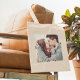 Laden Sie Ihr eigenes Foto hoch, um eine personalisierte Tasche zu erstellen. Diese Tasche hat einen einfachen, minimalistischen Stil mit schwarzen Schreibmaschinenbuchstaben und rotem Herzinfarkt unter dem eigenen quadratischen Foto.