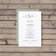 Minimalistische Einladungen zum Hochzeitsmenü - mit elegantem AquarellZweig und einfachem schwarzem Text. Die Rückseite dieser eleganten Karte ist staubig, pastellgrün.