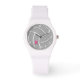 Diese sportliche volleyball-thematische Armbanduhr für Mädchen verfügt über ein Paar einfacher, minimalistischer Volleyballgrafik (zeigt nur die Nähte des Volleyballs in weiß und schwarz), die sich auf grauem Hintergrund leicht ausgleichen - mit ihrem Monogramm in Rosa von katz_d_zynes anpassen