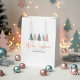 Weihnachtsgeschenktasche mit pastellfarbenen Bäumen und modernen festlichen Schriften in minimalistischem Design.