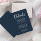 Einfache und stilvolle dunkelblaue Hochzeitsgast-Infodetails. Mit marineblau solidem Hintergrund und weißem Textlayout. Alle Informationen sind als Website, Transport, Unterkunft anpassbar. Genießen Sie es zusammen mit anderen Produkten aus dieser edlen, handgefertigten Hochzeitssuite.