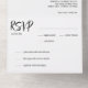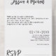 Die Präsentation der All-In-One Wedding Invitation aus der Elegance Collection - eine raffinierte und bequeme Lösung, die die Hauptseheneinladung mit einer abreißenden RSVP-Karte kombiniert, die alle elegant in einem Single gebündelt und durchgängig verpackt ist. Die wichtigste Hochzeitseinladung zeigt die zeitlose Schönheit der Elegance Collection, die durch klare Linien und moderne Ästhetik gekennzeichnet ist. Die schwarze Typografie auf unberührtem Weiß verspricht einen eindrucksvollen ersten Eindruck und setzt den Ton für eine Feier so raffiniert wie Ihre Liebe. Die Namen des Ehepaares, zusammen mit Datum, Uhrzeit und Veranstaltungsdetails, nehmen die zentrale Bühne, präsentiert mit Klarheit und Anmut. Im unteren Teil der Einladungssuite befindet sich eine abreißende RSVP-Karte, die es den Gästen leicht macht, schnell zu antworten. Die Karte ist voradressiert und enthält Optionen zur Annahme oder Ablehnung der Einladung. Eine perforierte Kante sorgt für eine saubere Träne, und die RSVP-Karte ist so konzipiert, dass sie bequem zurückgeschickt werden kann, was den UAWG für Sie und Ihre Gäste optimiert. Die mit Präzision und Liebe zum Detail gestaltete All-In-One Hochzeitseinladung aus der Elegance Collection ist nicht nur eine stilvolle Einführung in Ihre Hochzeit, sondern auch eine praktische und effiziente Möglichkeit, Antworten zu sammeln. Es spiegelt die raffinierte Eleganz Ihrer Liebe wider und sorgt dafür, dass jedes Detail mit Eleganz und Komfort präsentiert wird.