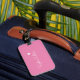 Ein elegantes und berufliches rosa Gepäckanhänger mit Namensfeldern (Sacramento Script Schriftart-Stil) an der Vorderseite und zusätzlichen Informationen an der Rückseite.. um Ihre Sachen stilgerecht zu identifizieren.