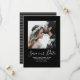 Minimalistisches Foto Ankündigung Datum freihalten mit einem frischen und schlichten quadratischen Foto-Ausschnitt-Design in Schwarz. Fügen Sie ein Foto und Ihre Hochzeitsdetails zu anpassen. Dünne weiße Streifen schmücken den hinteren Teil der Einladung. Hintergrundfarbe auf der Rückseite der Einladung kann geändert werden, um das Foto zu ergänzen oder Ihre Hochzeitsfarbe hinzuzufügen.