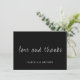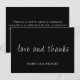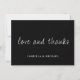Maßgeschneiderte Hochzeit Dankeschön Karte. Mit Liebe und Dank in Skript in weißem Schriftart auf einem schwarzen Hintergrund. Mit einer anpassbaren Nachricht auf der Rückseite.