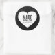 Moderner minimalistischer Aufkleber mit den Worten "Made with Liebe" in fett gedrucktem Schriftart und einem stilvollen Schriftsatz für Ihren Namen oder Shop-Namen in schwarz gegen ein weißes Herz. Benutzen Sie diesen Aufkleber zum Verpacken und Verpacken von Sachen wie handgefertigten Waren. Personalisieren Sie es, indem Sie den Platzhalter-Text ersetzen. Für weitere Optionen, wie zum Beispiel den Schriftart zu ändern und seine Größe, klicken Sie auf die Schaltfläche "Anpassen". *Bitte beachten Sie, dass das Zazzle-Wasserzeichen, das in der Zoomvorschau angezeigt wird, NICHT auf dem gedruckten Endprodukt erscheint. © Rosewood and Citrus