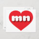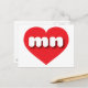 Diese Postkarte zeigt ein lebendiges rotes Herz mit den fett-, weiß-, abgerundeten Kleinbuchstaben, eine spielerische Abkürzung für Minnesota, den Staat des Nordsterns. Die Rückseite der Karte ist leer und wartet auf Ihren personalisierten Text oder Ihre handgeschriebene Stimmung.