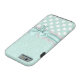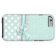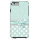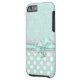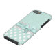 Schöner Minzgrün und weißes iPhone 6 Gehäuse, mit einem Minzgrün auf grünem Damast-Muster, oben, und einem Minzgrün mit weißem Polka-Punkt-Muster, unten. Die Grafik eines weißen Spitzen-Bands und eines winzigen grünen Bandes und Bogen verläuft in der Mitte zwischen den beiden Hintergründen. Anpassen, um Ihren eigenen Text hinzuzufügen. Tolle Art, stilvoll auszusehen und gleichzeitig Ihr Telefon zu schützen.