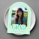 Présentant notre faire-part de graduation photo en arc vert menthe - un garde-robe élégant et moderne conçu avec une élégance minimaliste. L'avant comporte une photo en arc avec une fine bordure et le mot "grad" qui recouvre partiellement la photo. Le texte est en turquoise. Personnalisez le modèle en ajoutant votre année de diplôme, votre nom et votre école pour créer votre faire-part avec facilité. Au verso, téléchargez une photo pleine taille et ajoutez une ligne de signature. © Kimbellished, LLC