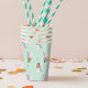 Celebrate your child's birthday with these kids paper party cups featuring a pattern of cute party hat illustrations on a mint green background for a woodland theme.