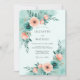 This design features a serene watercolor aesthetic with a refreshing palette of mint green, teal, and soft peach. Delicate peach roses and vibrant teal anemones are arranged in graceful clusters. The light seafoam background creates an airy and romantic atmosphere, perfect for an outdoor spring or summer event.