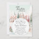 Eine charmante Babydusche mit Minze und rosa Aquarell Mairytale Winterszene mit gemütlichen Zuhause, Weihnachtsbäumen und Schnee in Erwartung einer kleinen Schneeflocke! Sie können diese Einladung mit Ihren eigenen Daten personalisieren.