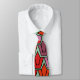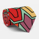Diese Krawatte hat ein Art Deko Design von Tulpen aus Pentagons und Trapeziden in Orange, Rot, lila, Gold und Grün.