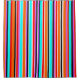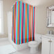 Dieser Duschvorhang hat ein einfaches Design aus vertikalen Streifen unterschiedlicher Stärke in Rot, Orange, lila, Schwarz, Hellblau und Weiß.