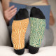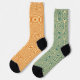 Muster bestehend aus zwei Arten von Mustern. Psychedelisch im 80er. Die eine Seite grün und die andere orange. Beide auf einem gelben Hintergrund, sodass sie gleichzeitig übereinstimmt und inkongruent ist. Verrückte Socken, die nicht jeder hat.