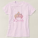 Der T - Shirt dieser Frau ist in Pink mit goldfarbener und rosafarbener Kronenkrönung und elegantem Text vorne zu sehen. Hat Beispieltext von "Kanada" darauf. Personalisieren Sie Ihren Namen, Ihren Namen, Ihren Titel oder eine andere Sache, die Sie sich wünschen.